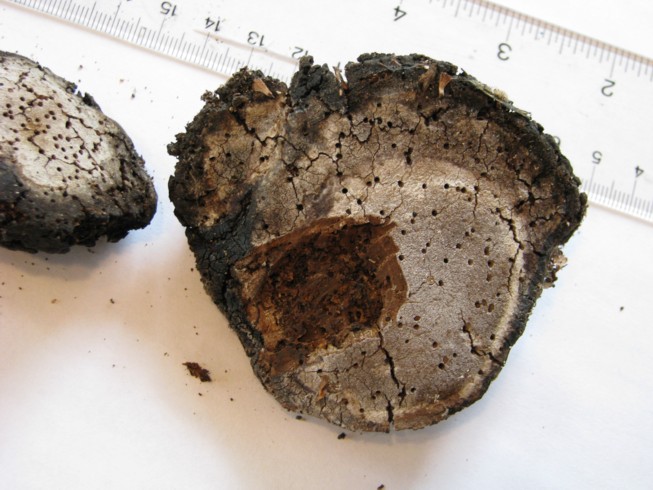The pores were seen on the underside of the body and the upper surface was covered with the rough black hardened hypha typical of the sclerotium (hardened mycelia).